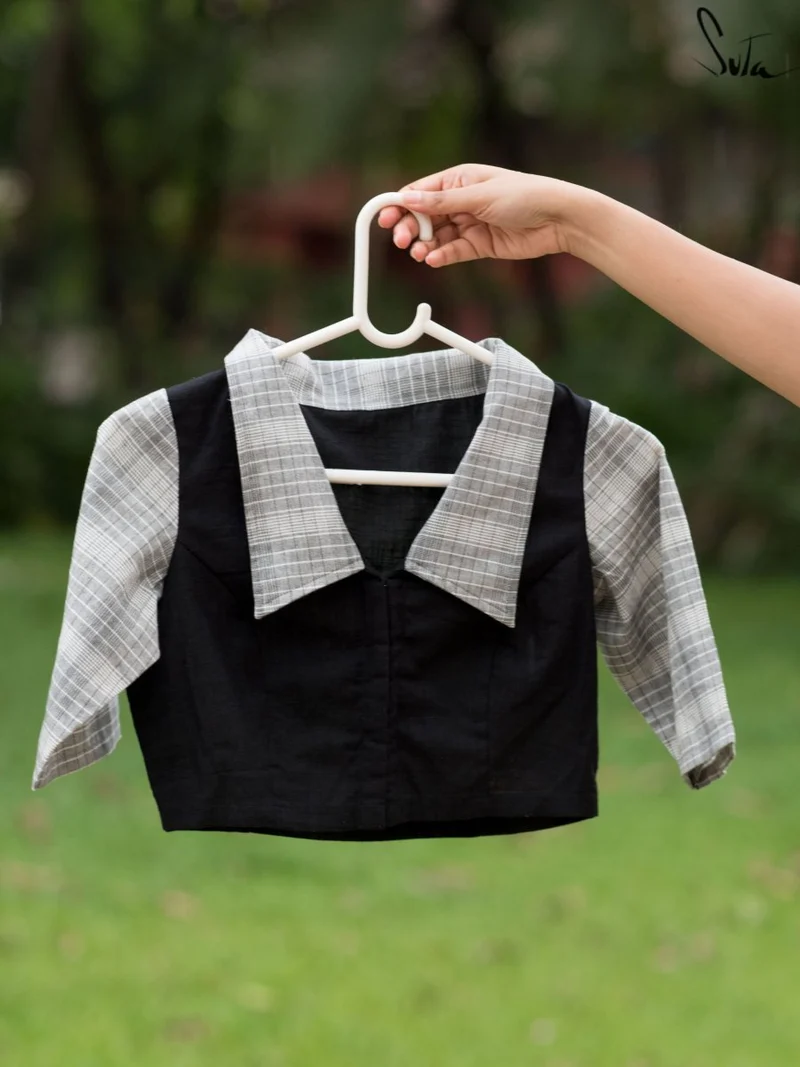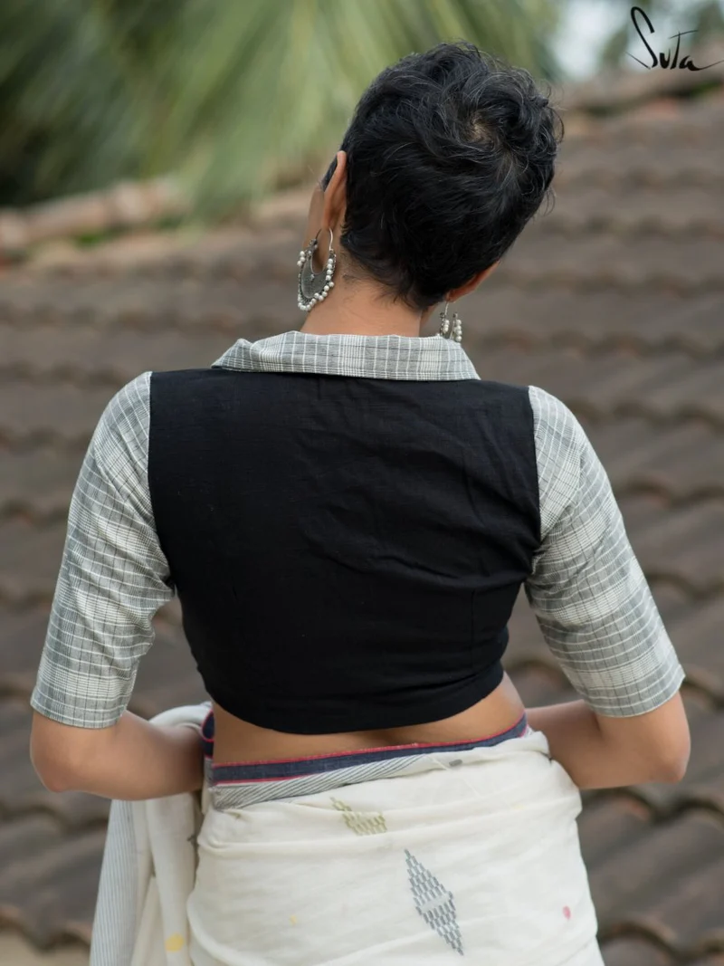 Black Cotton Elbow Sleeve Blouse With V Neck