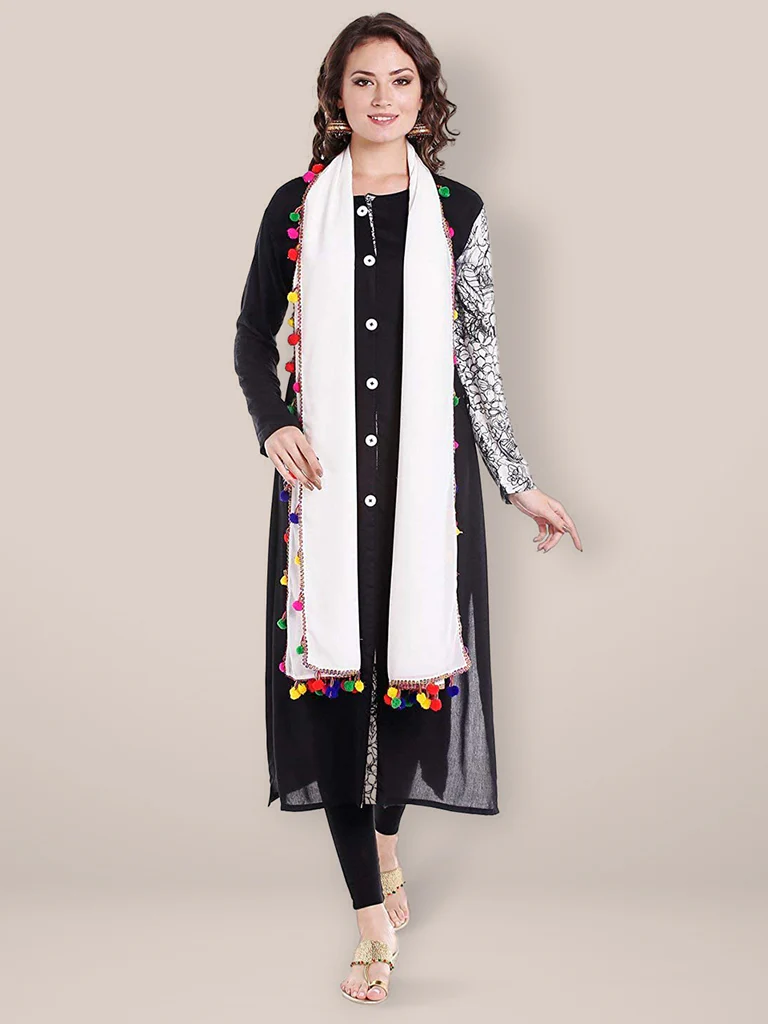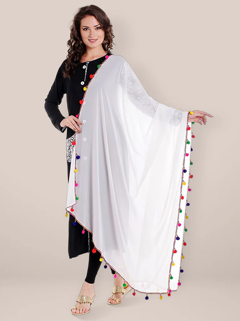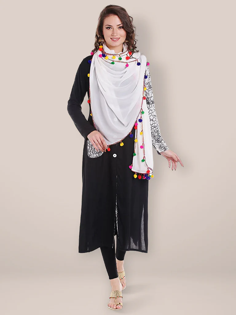 Add a touch of elegance to your wardrobe with this exquisite chiffon Dupatta. Swathed in charming, colourful pompom balls, this stunner is a must-have in your collection. Drape it around a solid or printed kurta, kurti, top or a skirt to give a touch of charismatic splendour to your ethnic diva look!