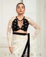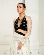 • Half And Half Full Sleeve Blouse With Zari nd Sequins Embroidered Black Velvet and Off-White Thread and Sequins Embroidered Net.