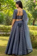 Featuring a grey lehenga in georgette base with thread, mirror, and tassels embroidery. It is paired with a blouse and an organza dupatta. Accentuate with chandbali earrings and heels for a wedding or sangeet ceremony.