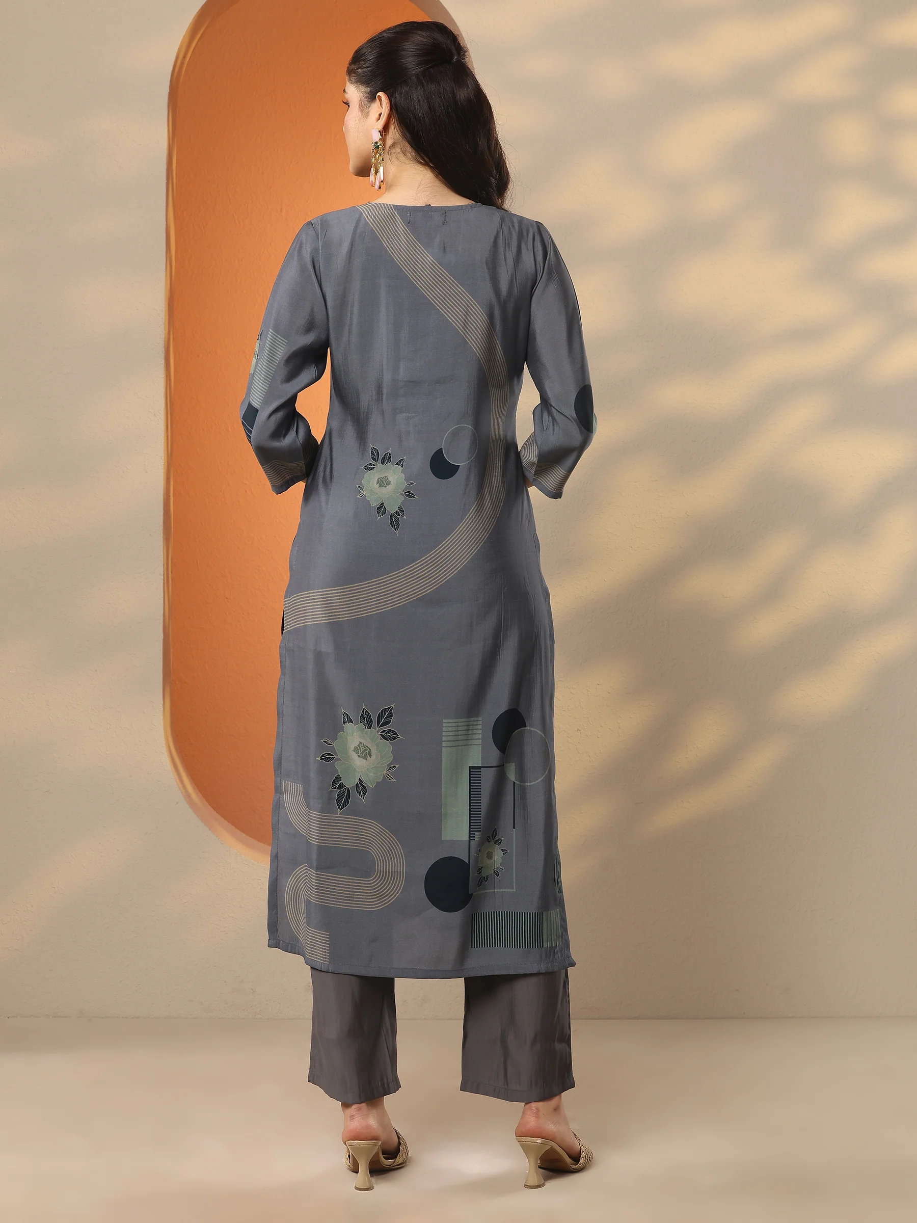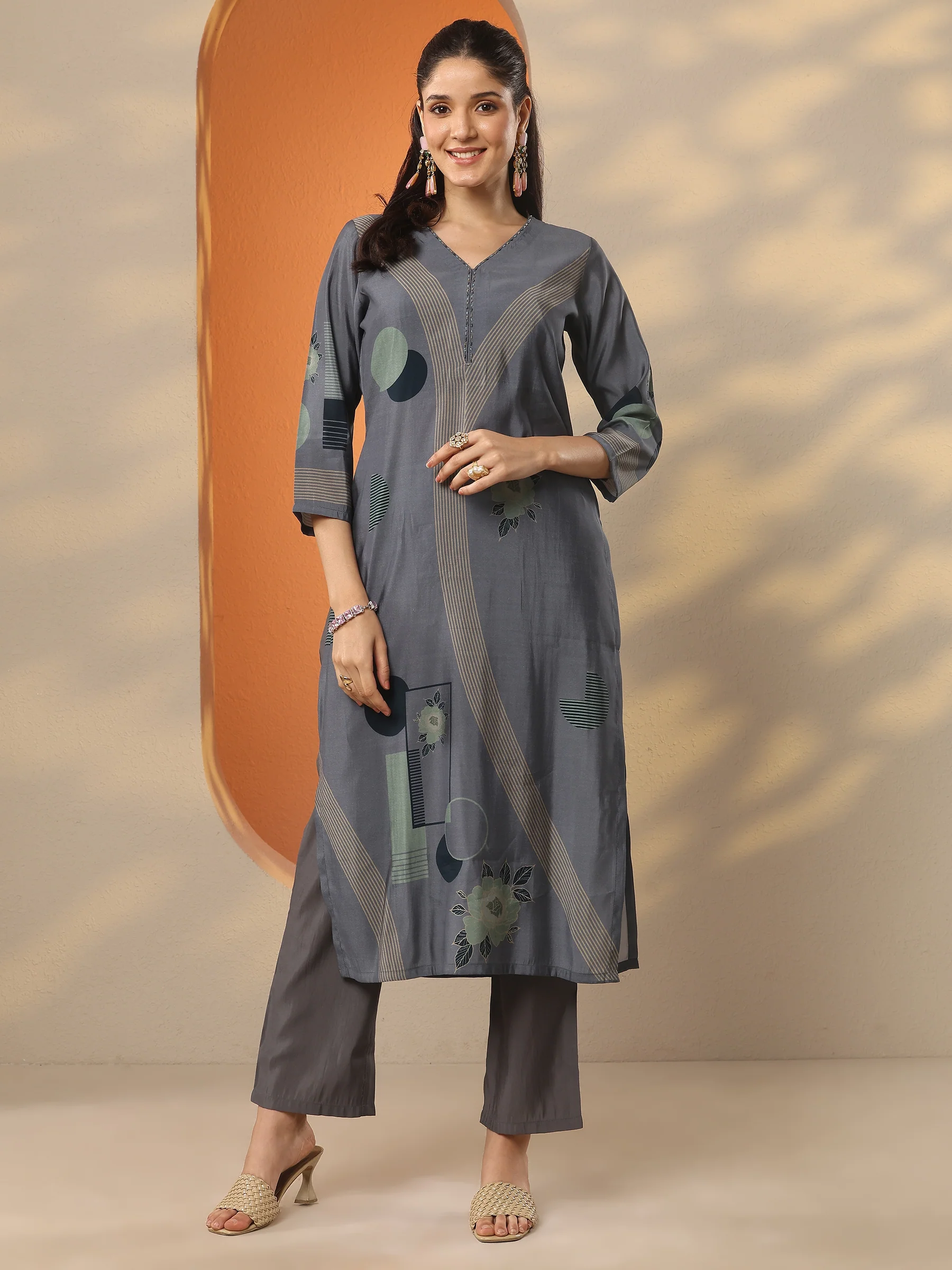 Grey Printed Silk Blend Straight Kurta