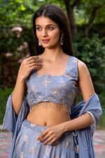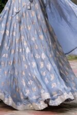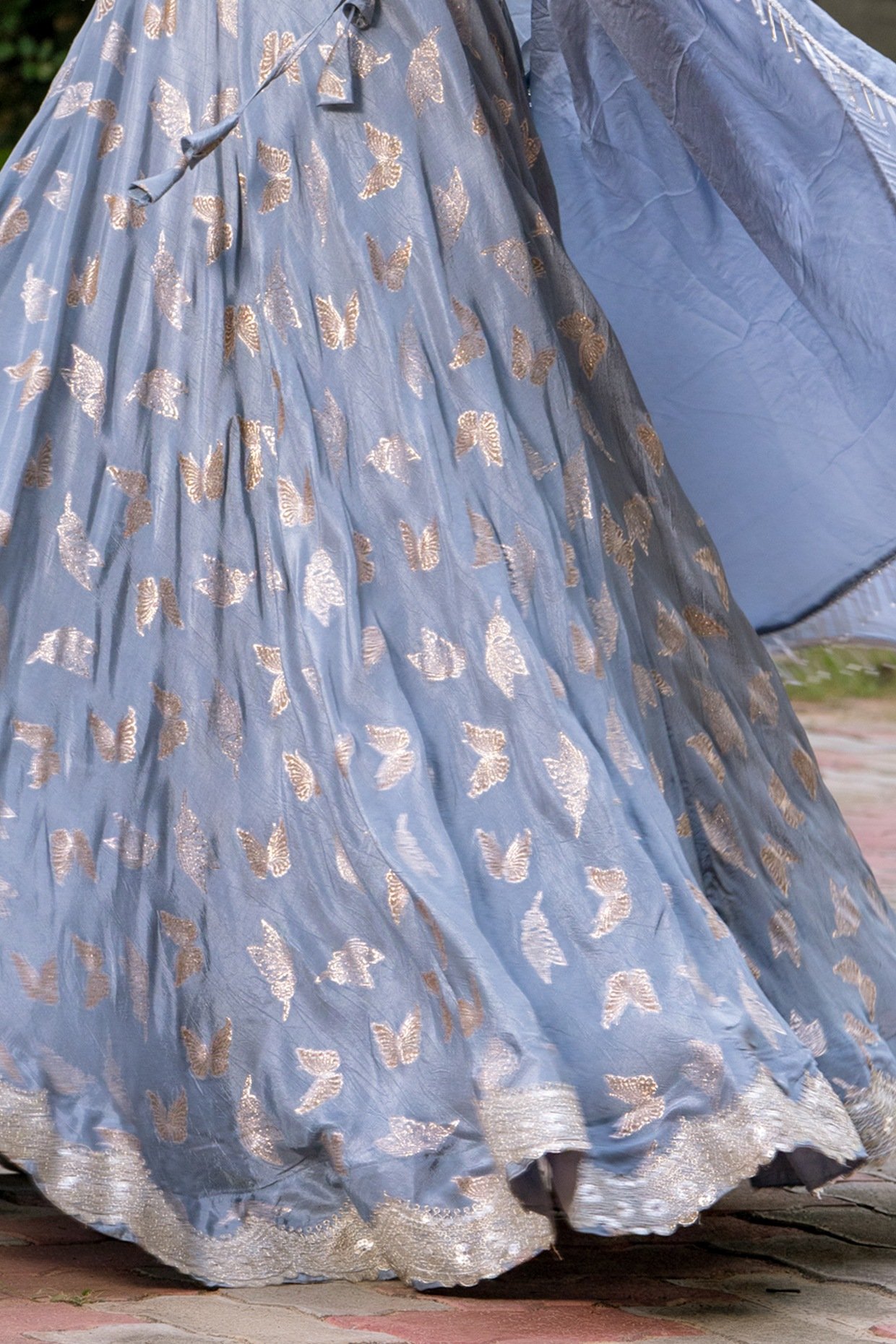 Featuring a grey lehenga in upada silk base butterfly detailing. It is paired with a blouse and an organza dupatta. Accentuate with chandbali earrings and heels for an engagement ceremony or a festive occasion.