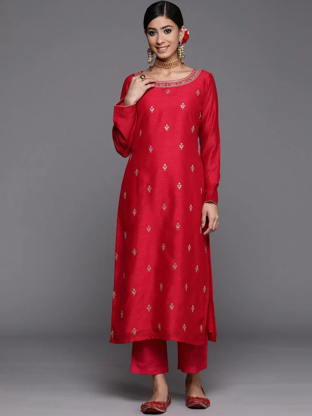 Red Embroidered Silk Blend Straight Kurta