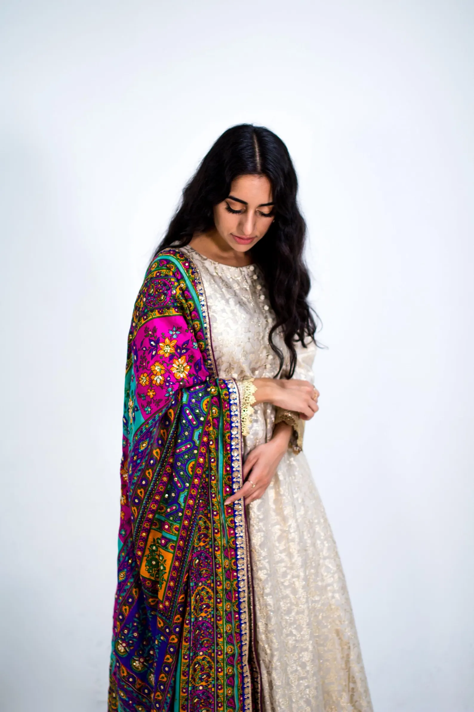 ✨ Turn every outfit into a statement with this luxurious multicolor silk dupatta, beautifully detailed with glass-shine sequins that sparkle with every movement. The vibrant patchwork-inspired print, paired with intricate embellishments, makes it a standout piece for any festive occasion.
