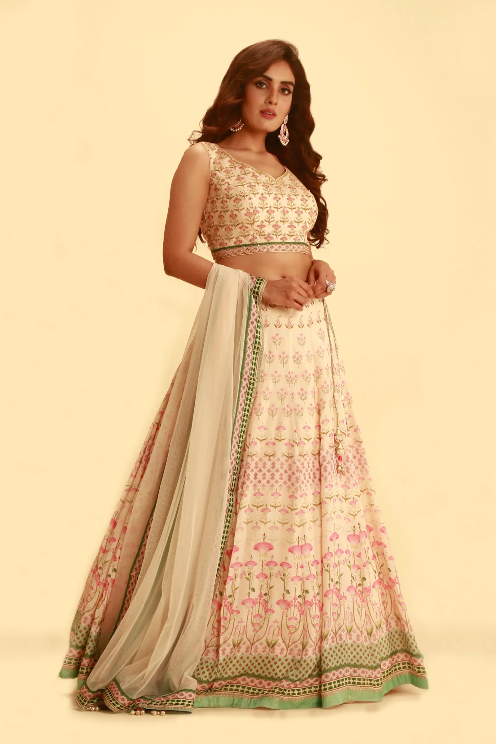 - Description: Indulge in the understated elegance of this pearled ivory white lehenga, adorned with bel buti patterns and rhinestone work. Pair it with pearl accessories for an ethereal, vintage appeal.