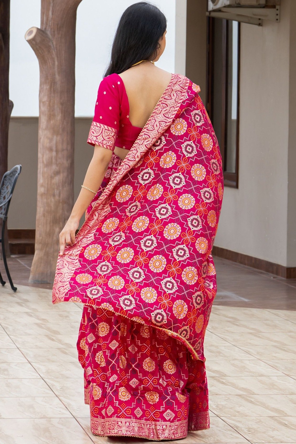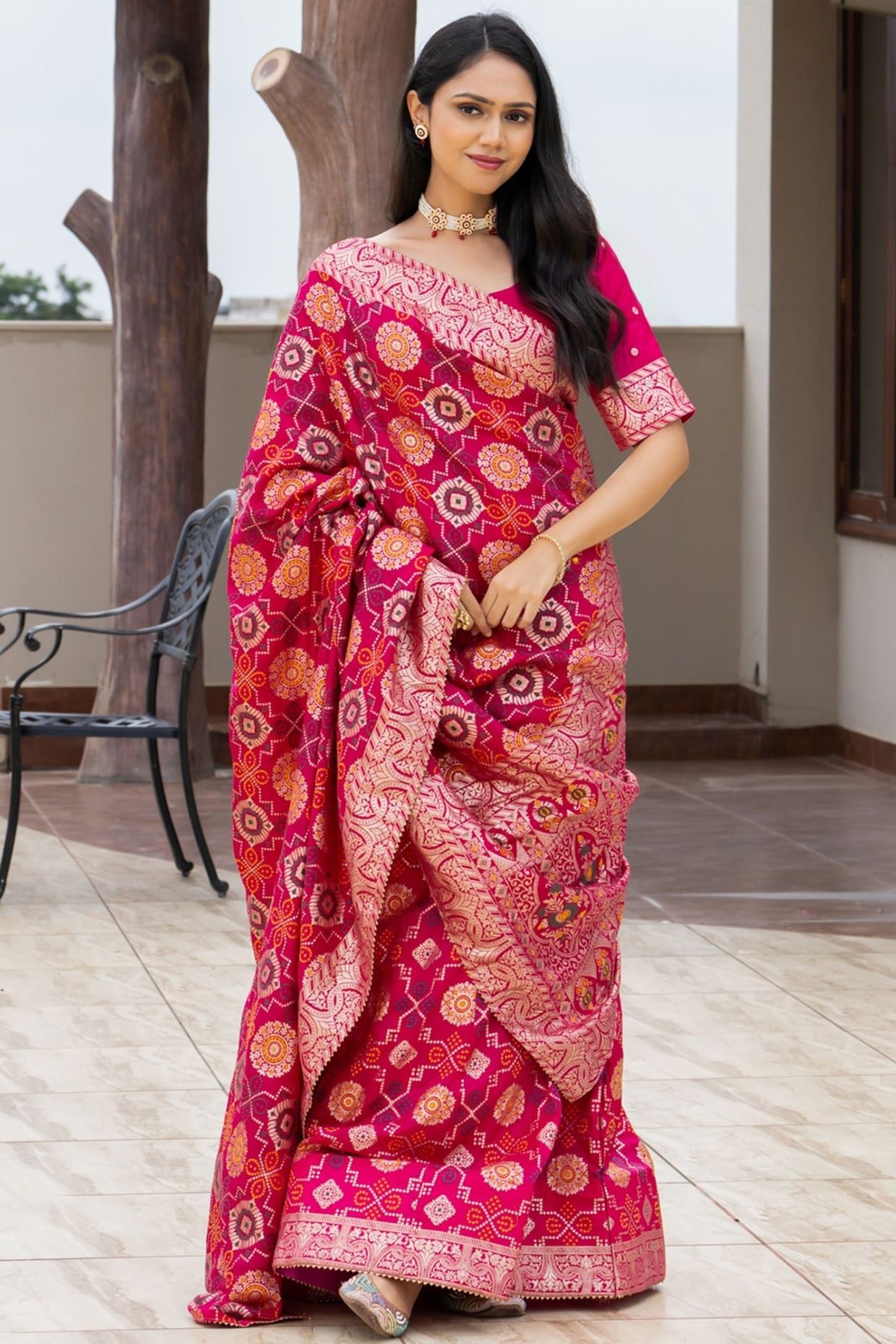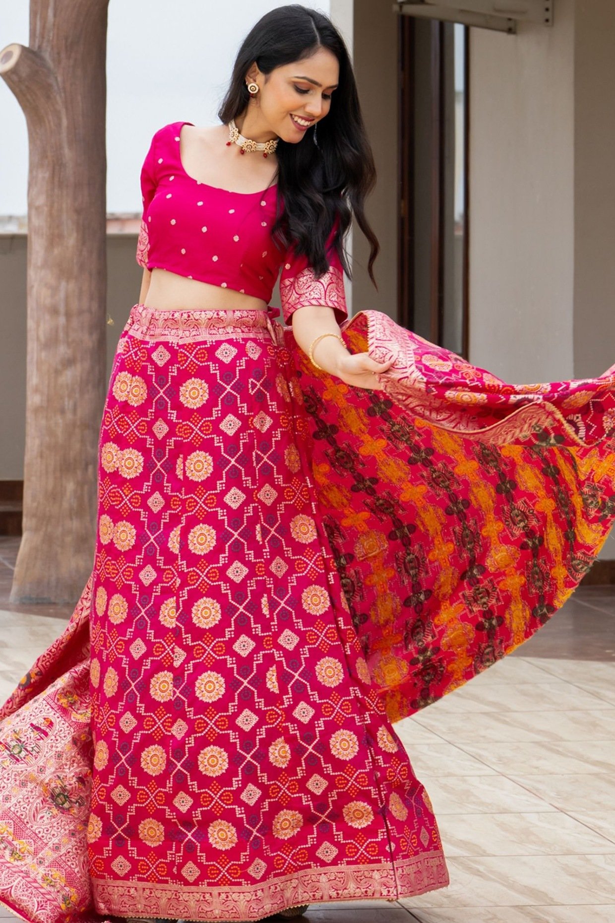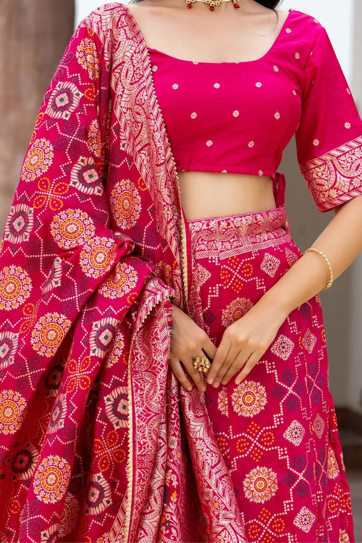 Featuring a Rani Pink lehenga in silk blend base. It is paired with a blouse and a dupatta. Accentuate it with diamond jewellery and block heels for sangeet, engagement ceremonies or weddings
