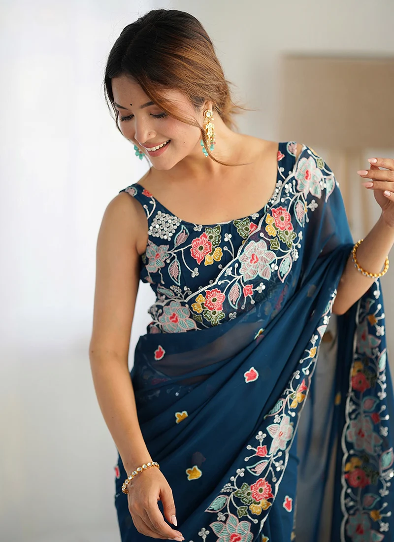 - Accompanying the saree is a Teal georgette embroidered sequins blouse which can be customized to suit your personal preferences. Whether you desire a more contemporary style with a deep Vneck or a more traditional cut with short or long sleeves the blouse can be tailored to create the perfect fit and design for your style. This level of customization allows for a truly unique and personal touch ensuring that the outfit not only looks but feels perfect when worn. The blouses sequins embroidery complements the saree maintaining a cohesive look while the customization offers versatility in terms of fit and design making the outfit adaptable for various body types and fashion preferences.
