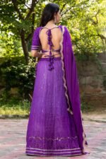 Featuring a violet lehenga in georgette base with embroidery and lace detailing on the hem. It is paired with a sequin-embroidered blouse and an organza dupatta. Accentuate it with dangler earrings and heels for a wedding or festive occasion.