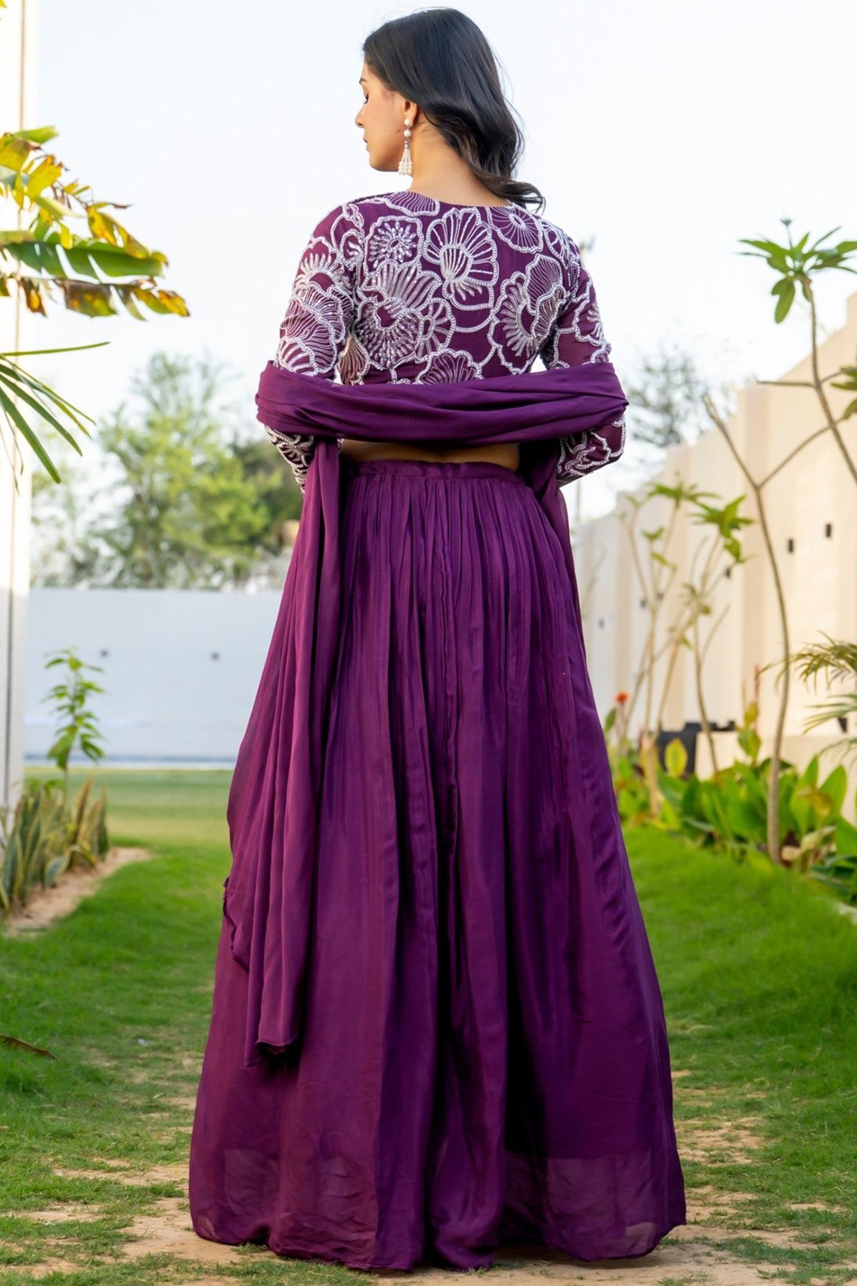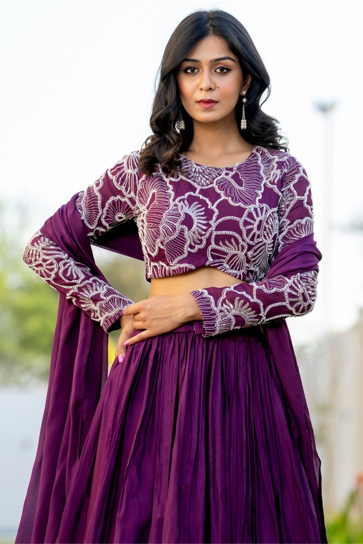 Featuring a wine lehenga in chinon and organza base. It is paired with a crop top having floral embroidery and a dupatta. Accentuate it with dangler earrings and heels for festive occasions or wedding ceremonies.